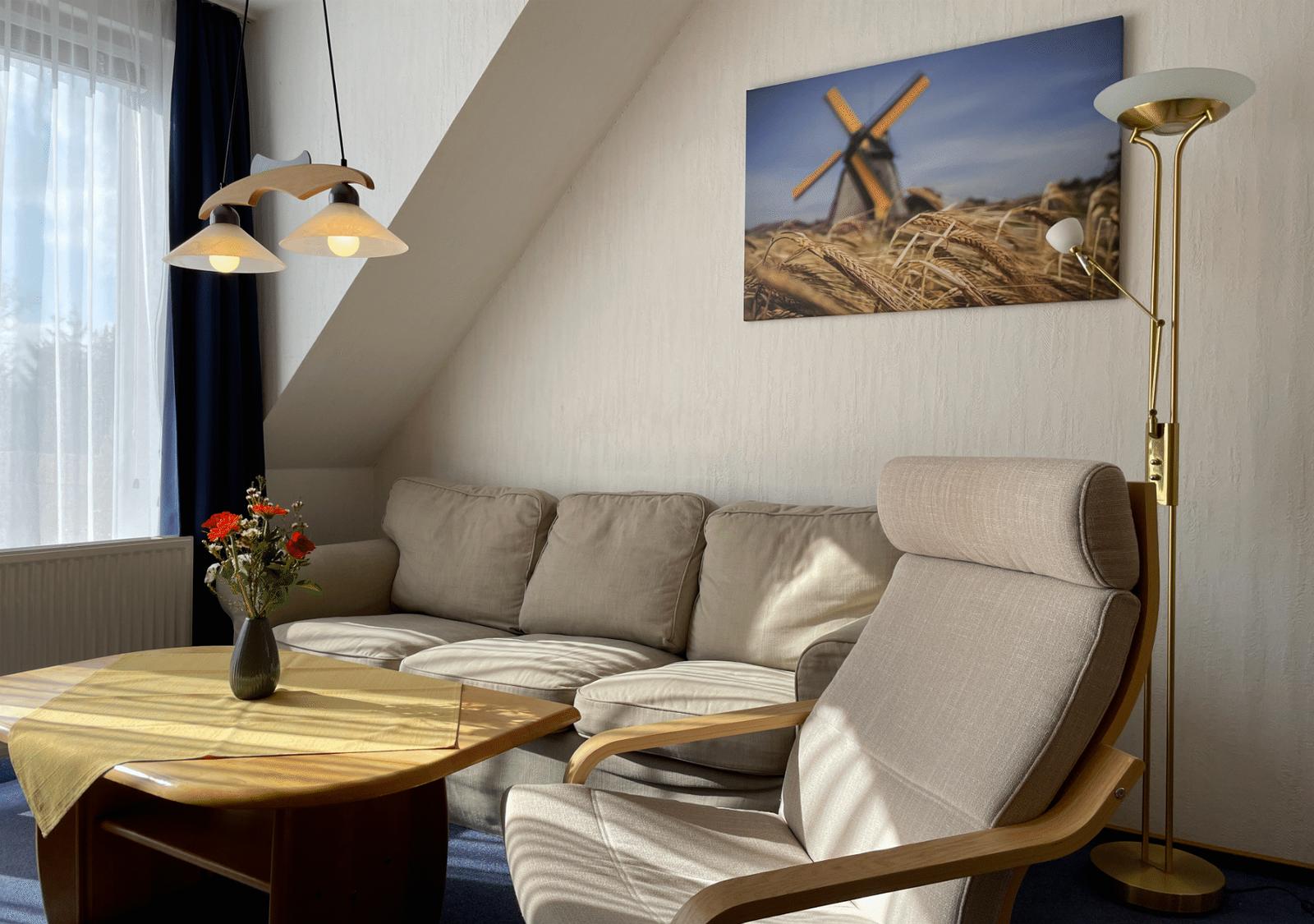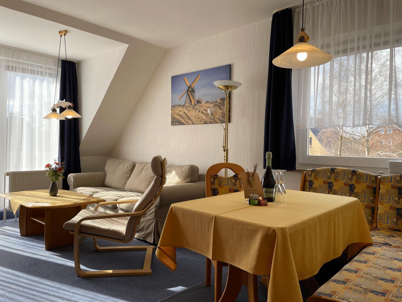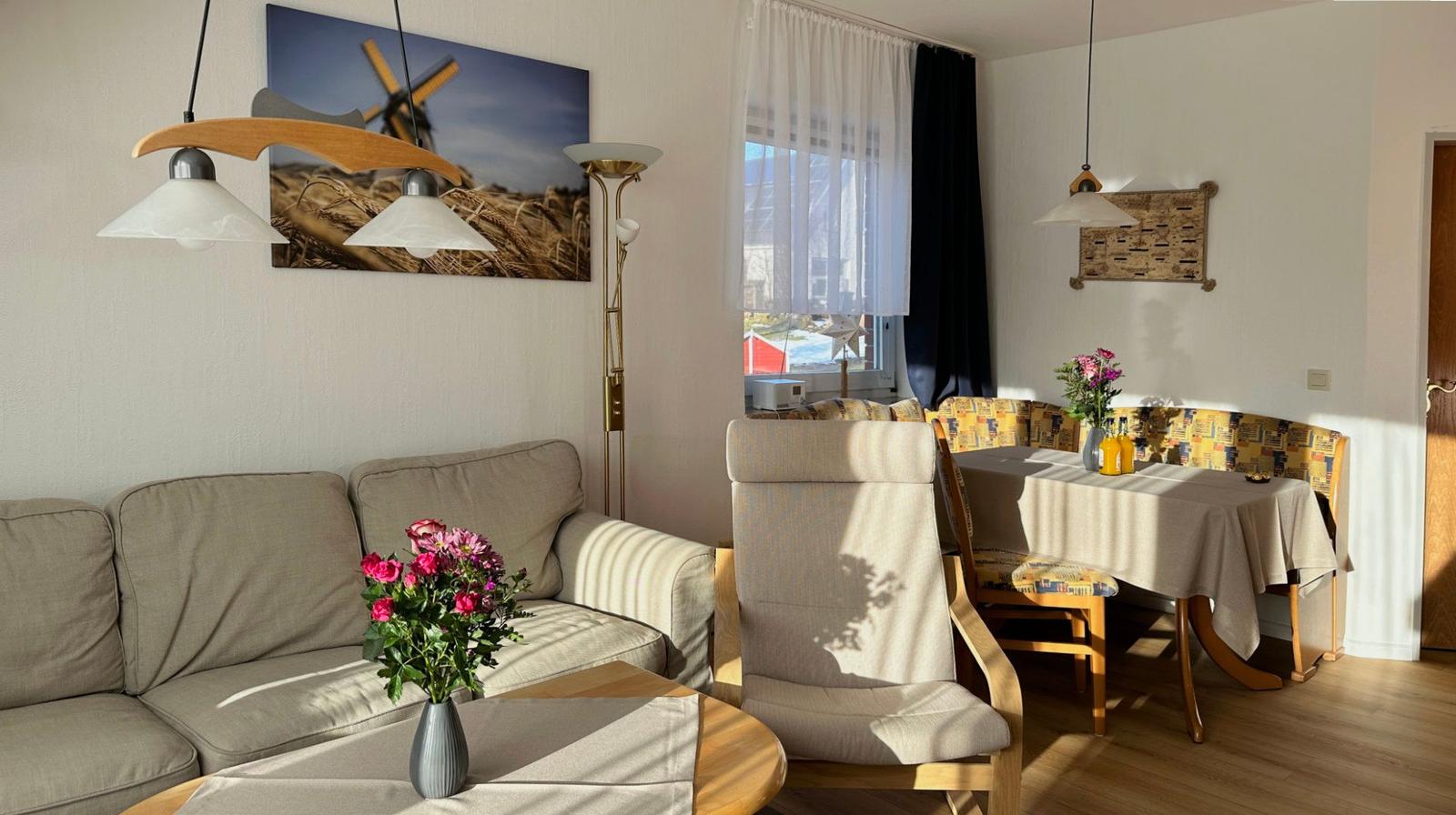 Die Wohnung ist ca. 50qm groß und perfekt für 2 Erwachsene oder 2 Erwachsene mit 2 Kinder geeignet. Als zweite Schlafmöglichkeit steht im Wohnzimmer ein Schrankklappbett (Breite 1,60m) zur Verfügung.