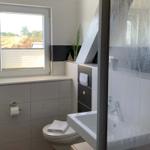 Nasszelle Dusche mit Trennwand, WC, Waschbecken, Fön und Handtüchern, Badezimmerschrank.