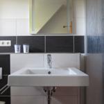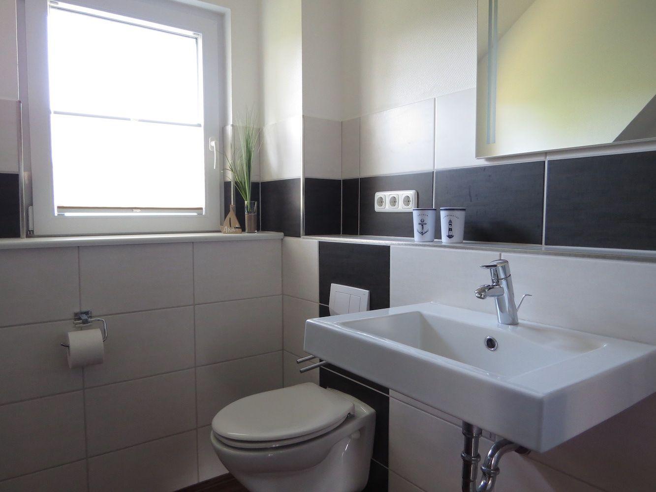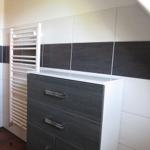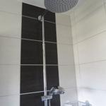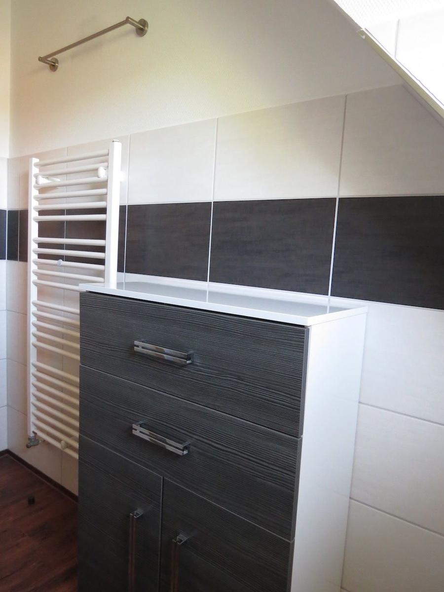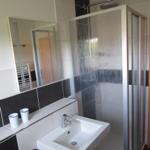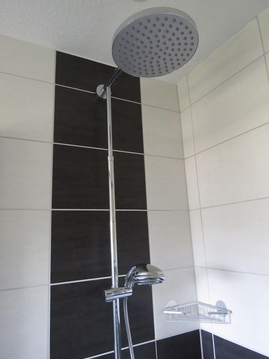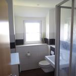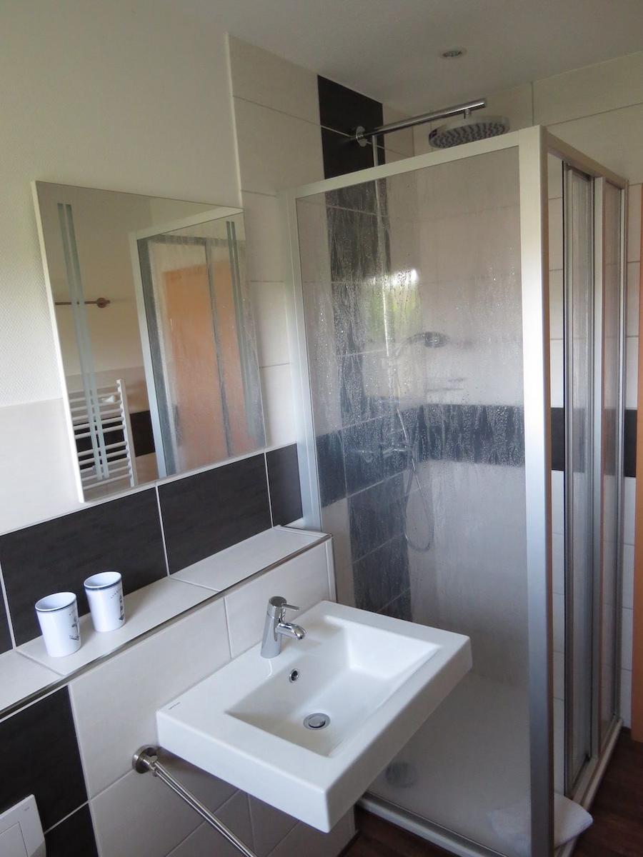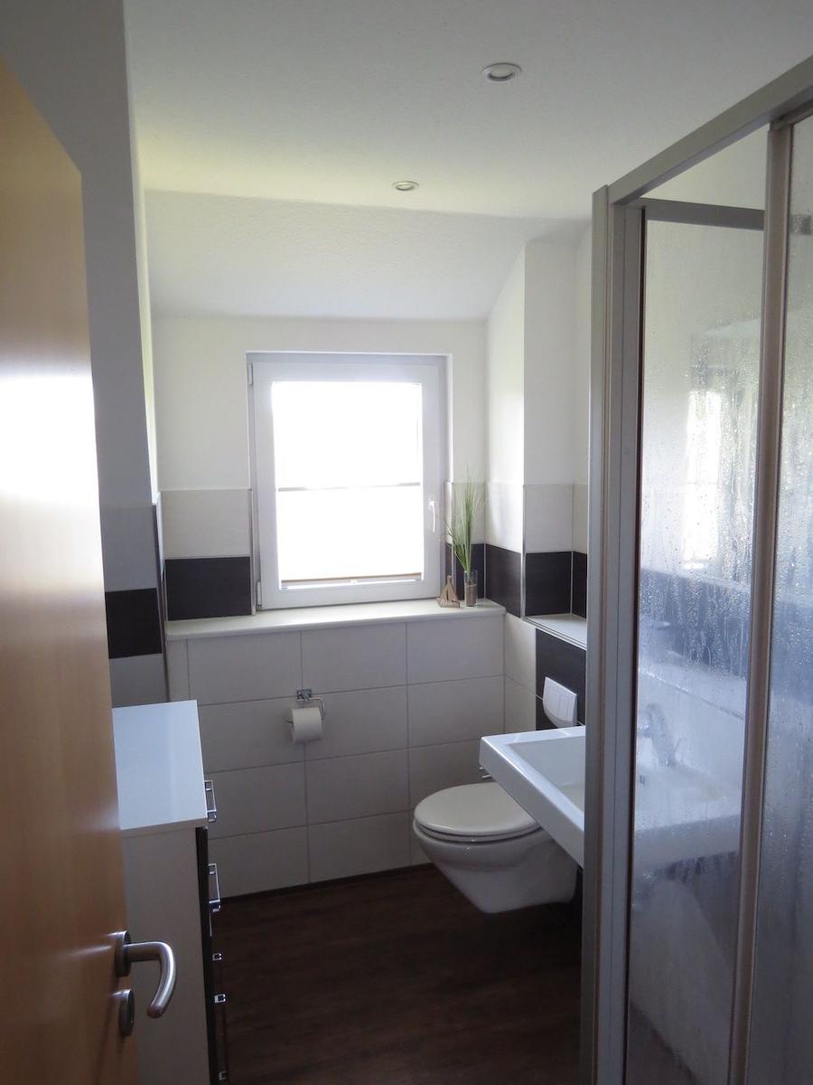 Bad mit Dusche /Duschtrennwand, WC, Waschbecken, Fön, Badezimmerschrank